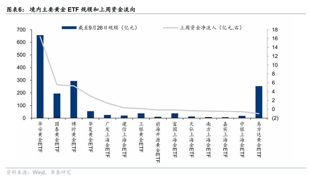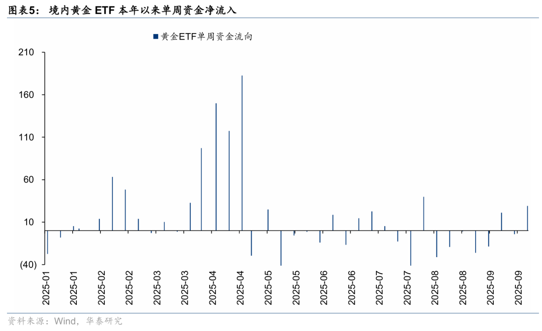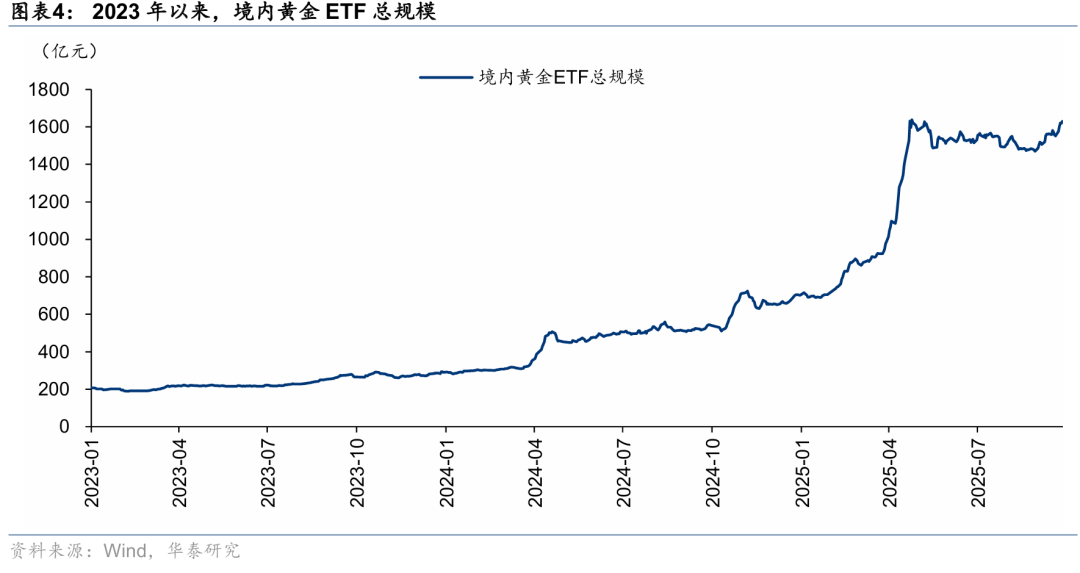 境内黄金ETF总规模亦从9月以来持续回升,截至上周五,14只黄金ETF规模总计1629亿元,较8月底增加近160亿元,逼近2025年4月24日的高点1638亿元。