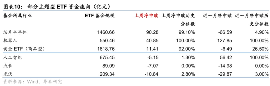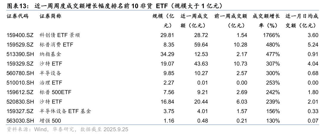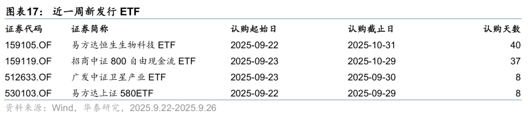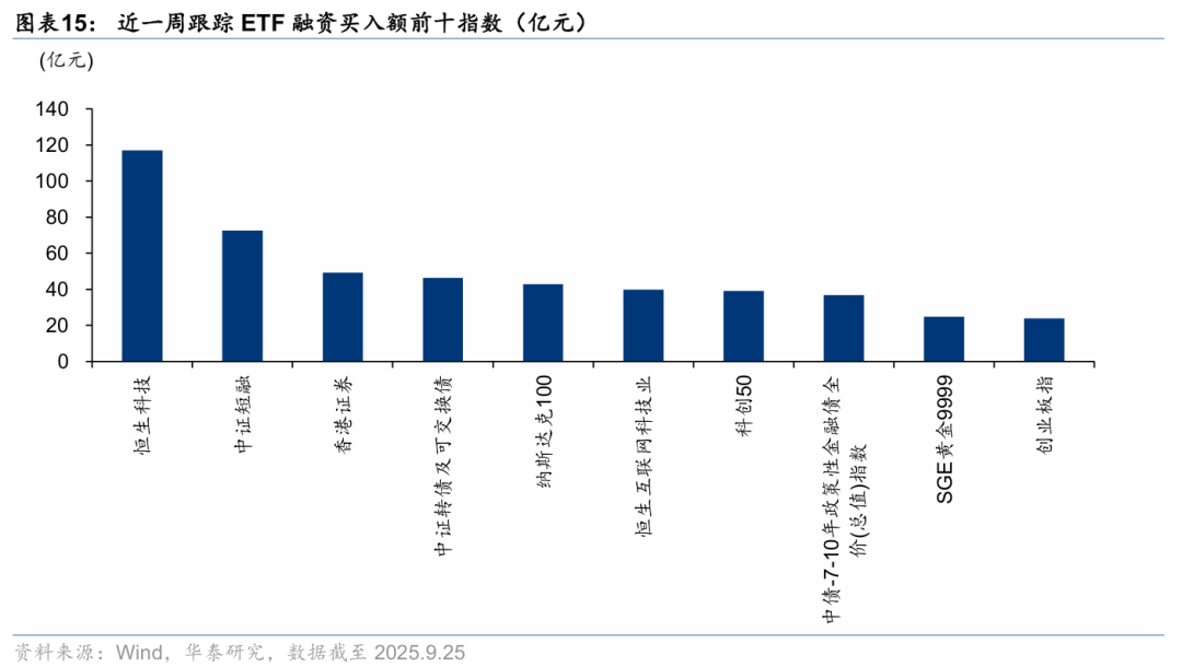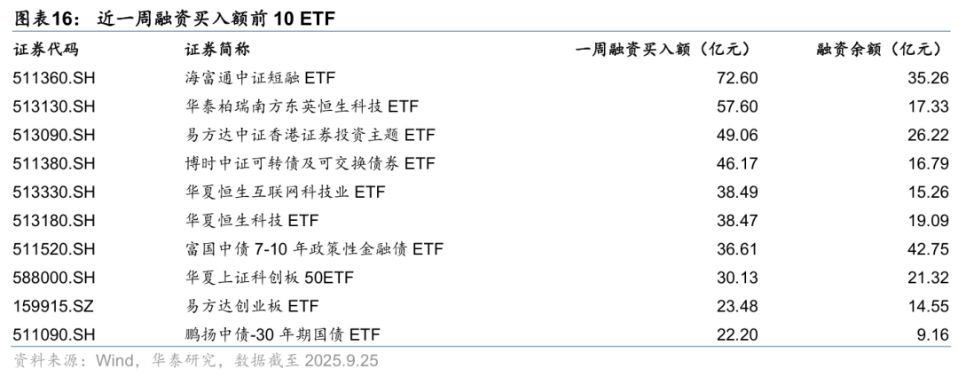 上周(2025/9/22-2025/9/25)ETF市场仍然延续宽基ETF净流出、行业主题ETF净流入的格局。跟踪主要宽基指数的ETF中,仅有跟踪中证A500的ETF净流入,沪深300和科创50ETF净流出额均在50亿元以上。行业主题ETF中,半导体、机器人、非银金融ETF净流入额相对较多,非银金融ETF净流入已经持续较长时间,但电子半导体ETF自2020年以来通常在价格上涨时伴随着资金净流出,上周电子行业涨幅领先但ETF资金净流入,或提示短期过热风险。近一周跟踪中证短融、AAA科创债、恒生科技等指数的ETF成交额较高,近一周恒科ETF、短融ETF、香港证券ETF的融资买入额较高。