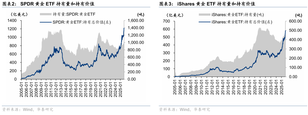 2025年8月20日以来,COMEX黄金连续五周上行,截至上周五累计涨幅近13%。海外主流黄金ETF——SPDR黄金ETF和iShares黄金ETF持有黄金总吨数持续上行,截至上周五,两只海外主流黄金ETF的持有量达到2022年8月以来的高点,持有黄金总价值创历史新高。